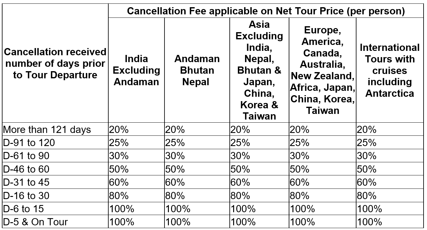 a. If guests wish to transfer their original tour to a new tour for any reason, then such transfer is treated as cancellation of the original tour and hence a fresh booking of the new tour has to be made. Cancellation charges will apply on the net tour price of the original tour. For the new tour, prevailing tour price and discounts will be applicable.